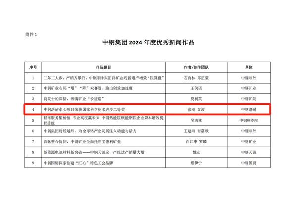 近日,中鋼集團2024年度優秀新聞作品、優秀新聞工作者評選結果揭曉,中鋼洛耐4部作品脫穎而出,榮獲“中鋼集團2024年度優秀新聞作品”,中鋼洛耐劉春紅獲評“中鋼集團2024年度優秀新聞工作者”。