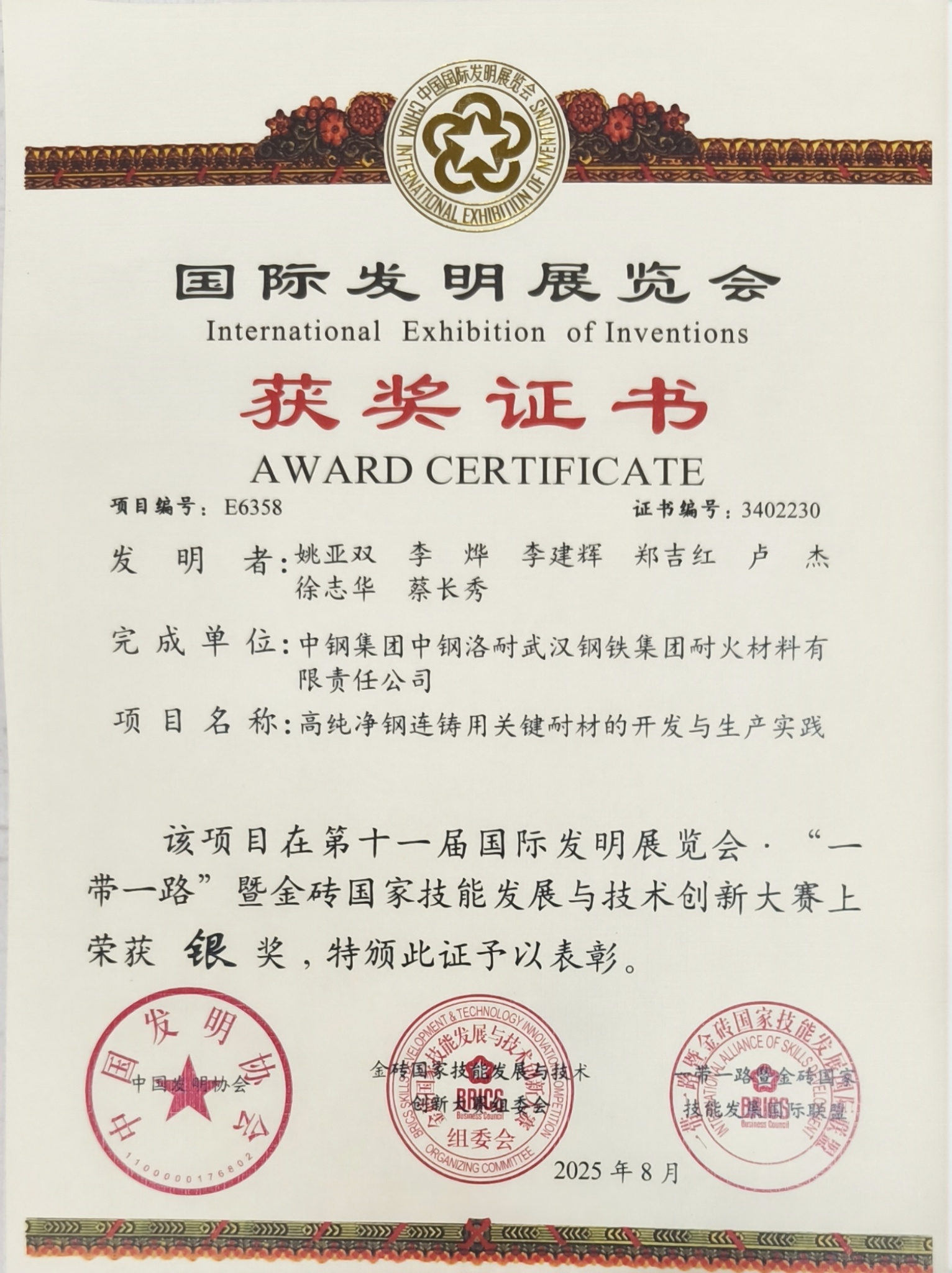 中鋼洛耐兩項創新成果斬獲第十一屆國際發明展覽會暨 “一帶一路” 暨金磚國家技能發展與技術創新大賽銀獎